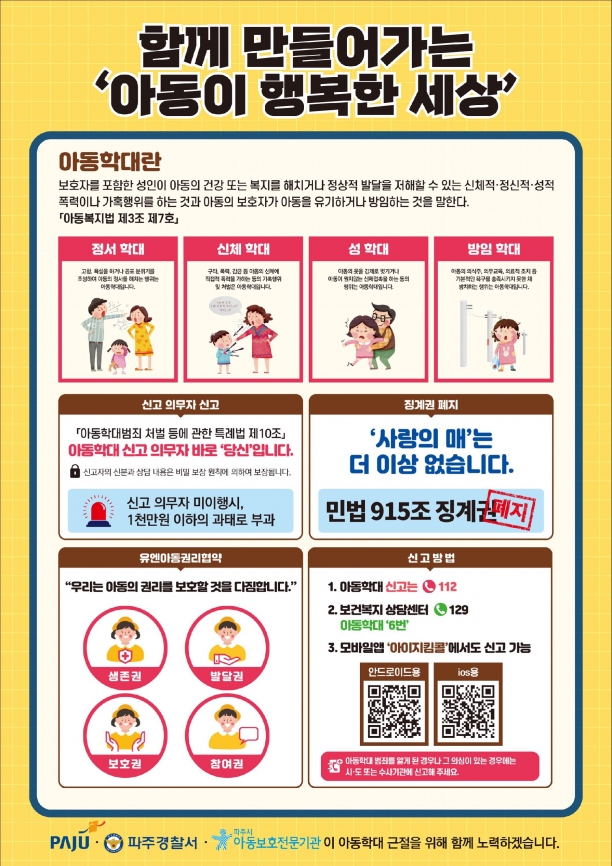 파주경찰서(서장 이재성)는, 오는 26일부터 아동학대 예방 포스터를 관내 보육시설(어린이집·유치원) 458곳에 배포한다.