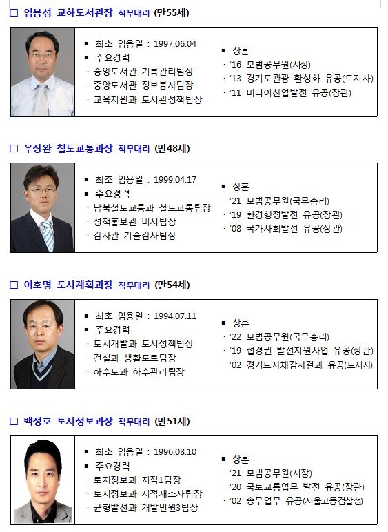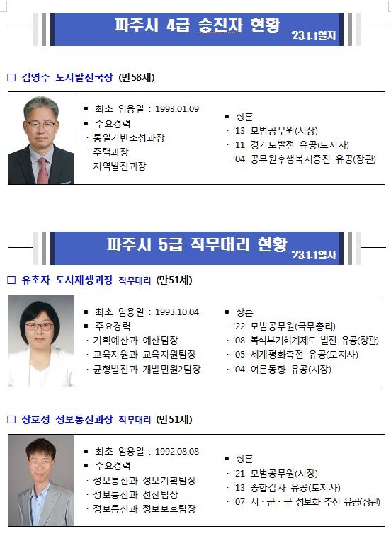 주요 승진 인사로는 도시발전국장에 김영수 남북철도교통과장이 승진임용 됐으며, 정보통신과장 직무대리에 장호성 정보기획팀장, 철도교통과장 직무대리에 우상완 철도교통정책팀장, 도시계획과장 직무대리에 이호명 도시정책팀장, 도시재생과 직무대리에 유초자 예산팀장, 토지정보과장 직무대리에 백정호 지적1팀장, 교하도서관장 직무대리에 임봉성 기록관리팀장이 임명됐다.