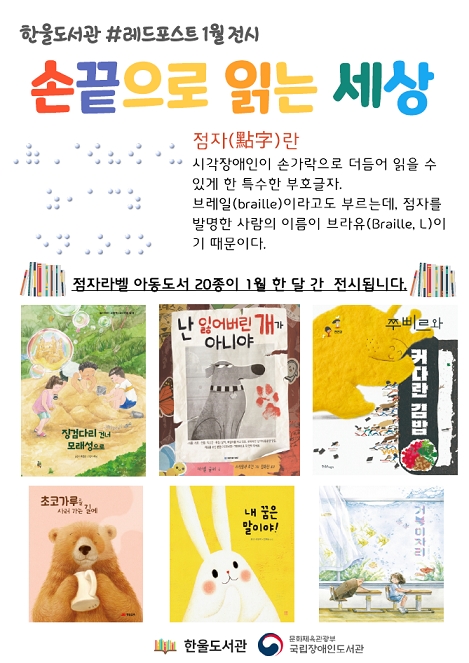 파주시 한울도서관은 1월 한 달간 한울도서관 로비에 위치한 서가 ‘#레드포스트’에 시각장애아동용 점자라벨도서 20종을 전시한다.