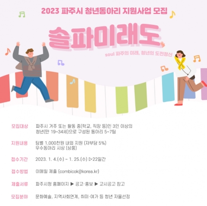 신청 대상은 파주시에 거주하거나 활동하는 만 19세부터 만 34세 청년 3명 이상으로 구성된 동아리다. 지원 분야는 청년들이 자율적으로 정할 수 있으나, 단순 친목이나 정치·영리·종교 목적 및 학원·공방 등 수익 창출 목적의 동아리는 지원할 수 없다.