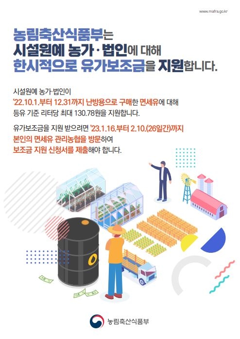지원 대상은 농협에 농업기계 보유현황 및 난방기 재배계획 신고를 하고, 면세 유류 구매 카드를 발급받은 시설원예 농가·법인으로, 2022년 10월 1일부터 12월 31일까지 사용한 면세유를 지원하며, 난방용 면세유 구매분에 대해 보조금 지원신청서를 제출하면 지원금을 받을 수 있다.