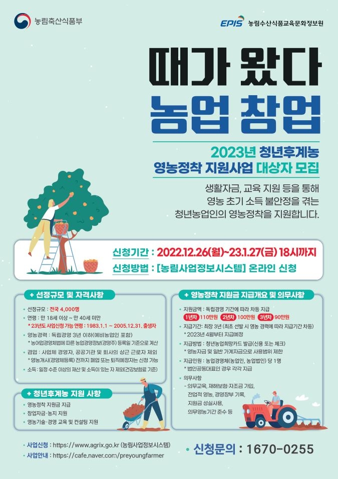 만 18세 이상부터 만 40세 미만의 영농경력이 없거나 독립경영 3년 이하면 신청할 수 있으며, 농림사업정보시스템(www.agrix.go.kr)을 통해 접수하면 된다.