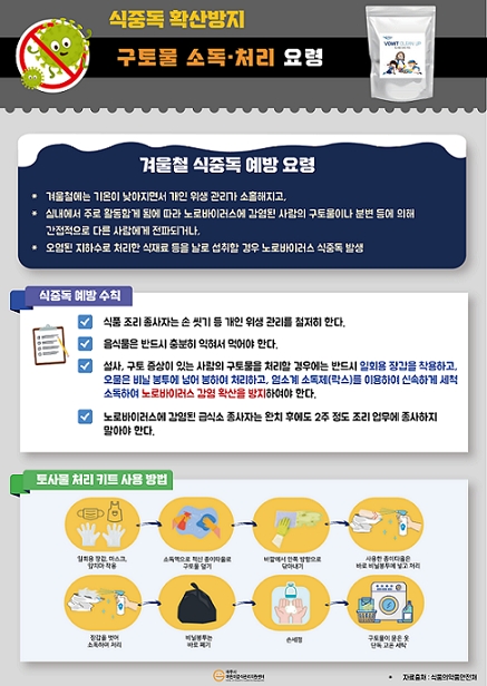 겨울부터 이른 봄까지는 노로바이러스로 인한 식중독 의심 환자가 많아지는 시기로, 환자의 분변과 구토물로 인한 2차 감염이 이뤄질 수 있어 이를 미연에 방지하고자 ‘토사물처리키트’ 및 교육 자료를 지원했다.