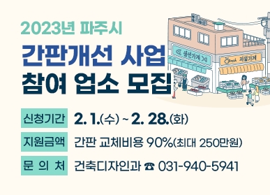 파주시 간판개선사업은 불법·미관 저해·노후 간판의 교체 비용을 지원하는 사업으로, 「파주시 예쁜간판 공모전 수상 디자인」을 적용하는 등 거리 특색에 맞는 LED 간판으로 교체하려는 업소를 대상으로 한다.