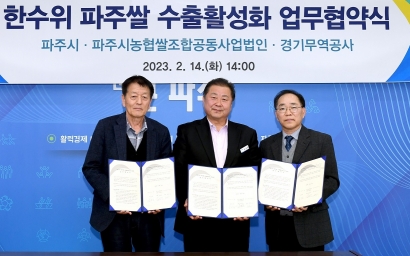 파주시(시장 김경일)는 14일 파주시농협쌀조합공동사업법인·경기무역공사와 ‘한수위 파주쌀 수출활성화’를 위한 업무협약을 체결했다.