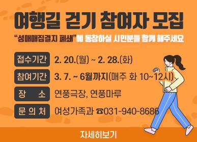 여행길 걷기는 성매매집결지 폐쇄에 대한 시민의 참여로 성평등 인식과 문화를 확산하고자 성매매 예방 교육과 연풍리에 소재한 성매매집결지를 걸어보는 프로그램으로, 3월부터 6월까지 매주 화요일 오전에 진행될 예정이다. 프로그램은 성매매집결지 폐쇄에 관심 있는 만 18세 이상의 시민은 누구나 참여할 수 있다.