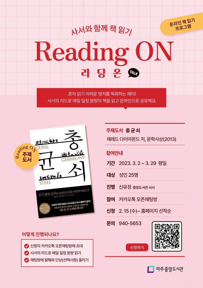 파주시중앙도서관은 3월 2일부터 29일까지 ‘2023 사서와 함께 책 읽기 리딩온(Reading ON)’을 시작한다.