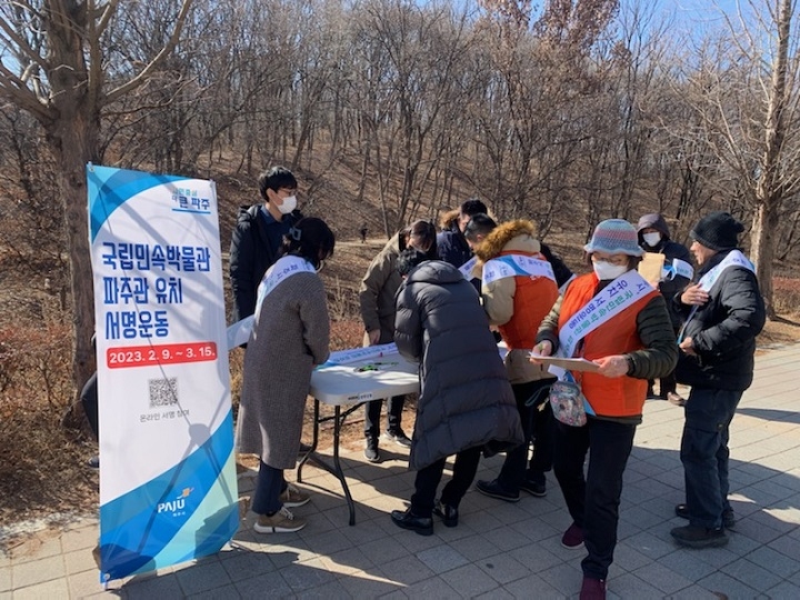 또한, 각 읍면동 이통장협의회, 자원봉사 단체 및 유관기관은 유동 인구가 많은 장소에 홍보부스를 운영하는 등 파주시 민·관이 한마음으로 국립민속박물관 파주관 유치를 위한 서명운동 홍보에 적극 동참하고 있다.