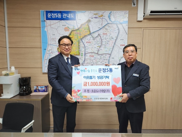 신승화 운정5동장은 “지역 내 어려운 이웃을 위한 복지사업에 힘을 보태주셔서 감사드린다”며 “기탁한 성금은 주변의 소외계층을 위한 사업에 쓰겠다”고 말했다.
