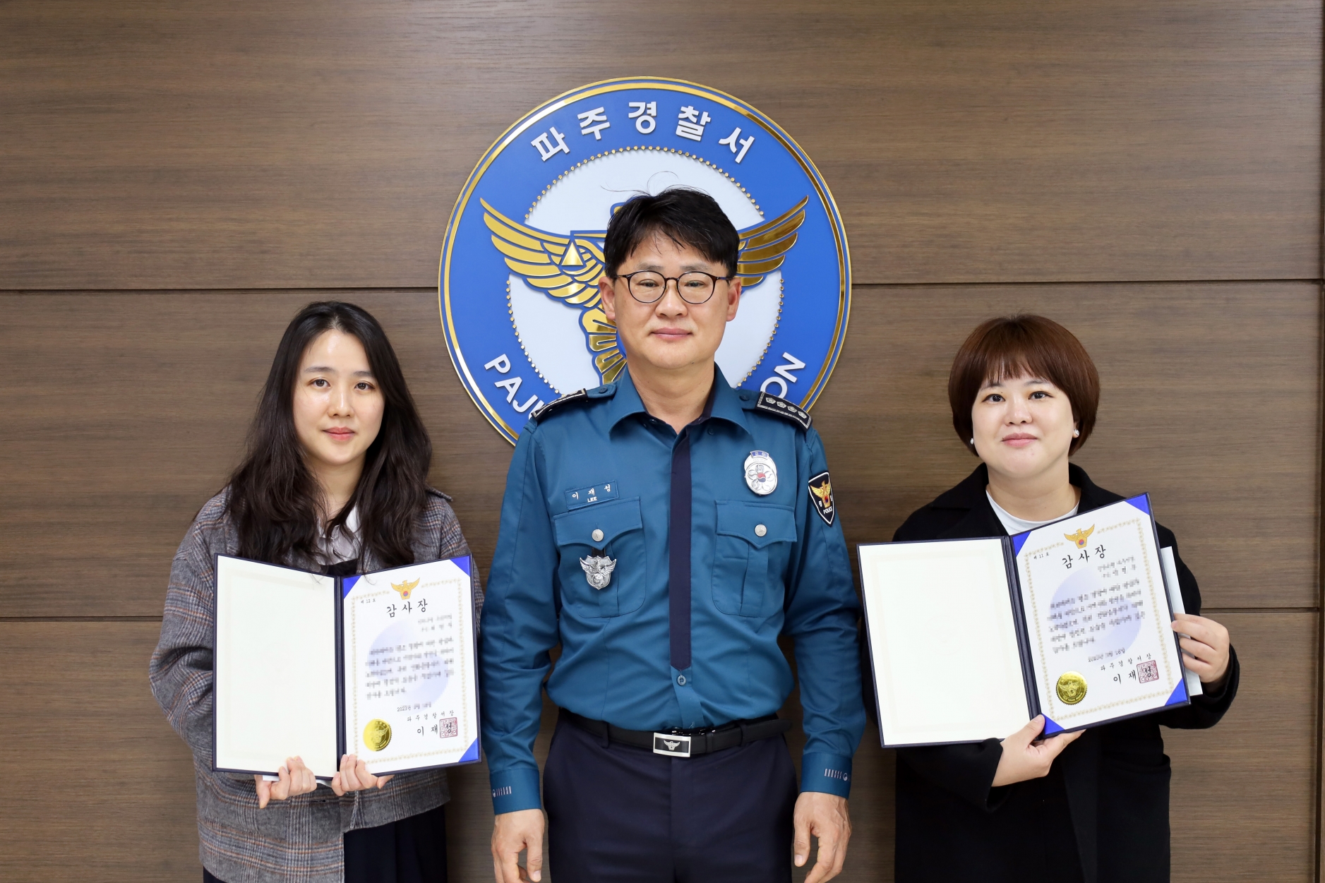 파주경찰서(서장 이재성)는 ’23. 3. 16.(목) 보이스피싱 범죄를 예방한 관내 모 은행 파주지점, 운정지점 은행원 2명에게 감사장과 보상금을 전달했다고 밝혔다.