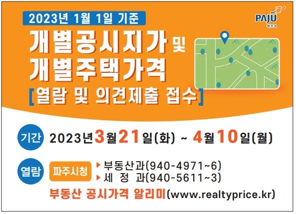 파주시는 2023년 1월 1일 기준 시 전체 31만 1,431필지에 대한 개별공시지가 지가산정 및 감정평가사 검증을 마치고 오는 21일부터 4월 10일까지 열람과 의견제출을 받는다고 밝혔다.