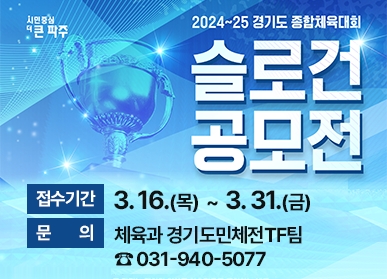파주시는 「2024~25년 경기도 종합체육대회」의 성공적 개최를 위해 오는 31일까지 슬로건 공모전을 진행한다고 밝혔다.
