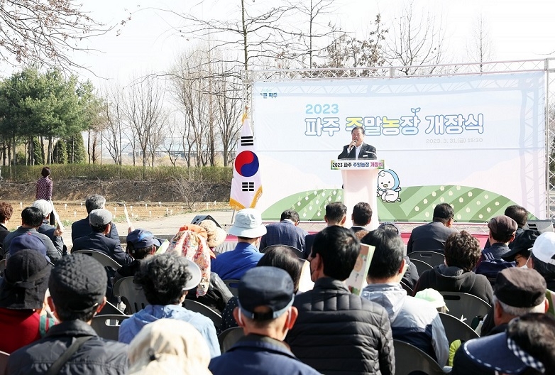 이날 개장식에는 주말농장 선정자를 비롯해 김경일 파주시장, 국회의원, 도시 의원, 농업인 단체장 등 1,000여 명이 참석한 가운데 식전 공연, 경작자대표 명패전달, 토종종자 홍보전시관 운영, 다육 식물 판매 부스 운영 등의 순으로 진행됐다.
