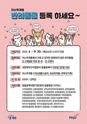 파주시는 4월 3일부터 11월 30일까지 ‘장애인 및 저소득계층 반려동물 진료비 등 지원 사업’ 신청을 받는다고 밝혔다.