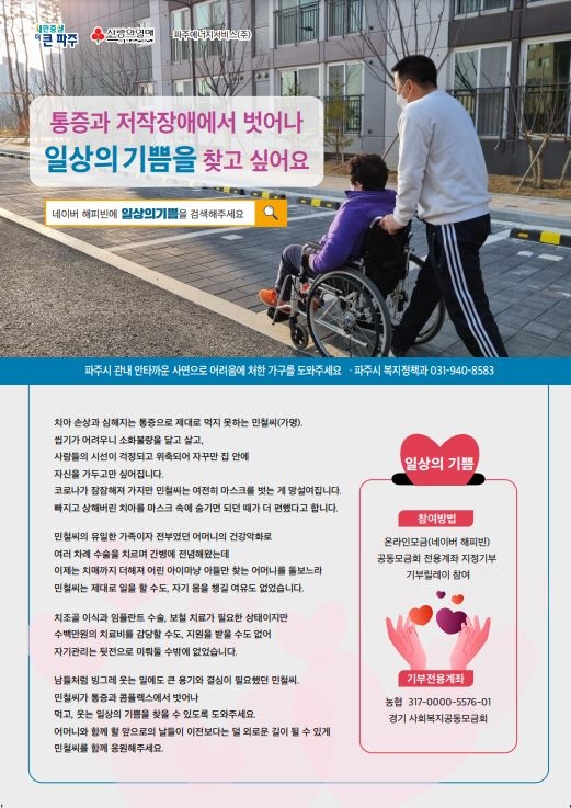 한편 테마모금 「나눔으로 싹이트는, 드림씨앗」 사업은 안타까운 사연으로 어려움에 처한 위기가구를 지원하기 위한 파주시 자체 모금사업으로, 1기부터 6기까지 6가구에 치료비·생계비 등으로 약 7,500만원의 모금액을 지원하고 있다.