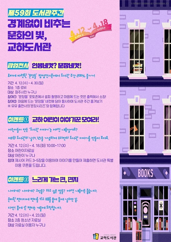 또한 ‘제59회 도서관 주간’에는 각 자료실에서 체험행사를 준비했다. 문헌자료실에서는 문장들 사진 촬영 및 필사를 할 수 있는 ‘인생네컷? 문장네컷!’, 어린이자료실에서는 단어카드로 이야기를 만드는 ‘도서관 이야기꾼’, 청소년자료실에서는 현재의 고민에 대한 이야기를 미래의 나에게 전하는 ‘느리게 가는 편, 편지’를 진행한다.