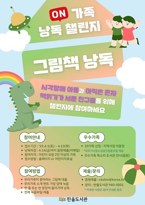 파주 한울도서관은 4월 20일 장애인의 날을 맞아 시각장애 아동을 위한 낭독 프로그램 ‘ON(온)가족 낭독챌린지’를 운영한다고 밝혔다.