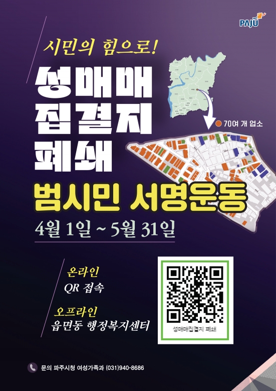 파주시는 4월부터 5월 31일까지 성매매 집결지 즉각 폐쇄를 위한 범시민 서명운동에 돌입했다고 밝혔다.
