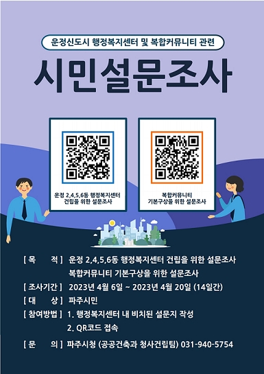 파주시는 4월 20일까지 운정 지역 행정복지센터(4개소) 건립에 대한 주민들의 의견을 수렴하기 위한 주민설문조사를 실시한다고 밝혔다.