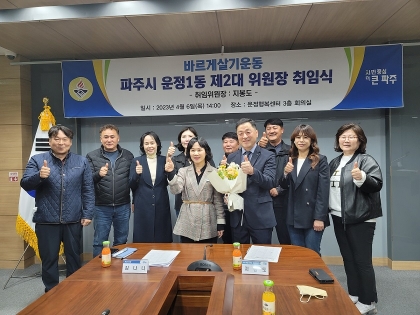 이날 행사는 윤영삼 운정1동 통장협의회장, 윤성준 운정1동 새마을지도자협의회장, 바르게살기운동위원회 위원 등 20여 명이 참석한 가운데 지봉도 신임위원장이 제2대 위원장으로 취임했다.