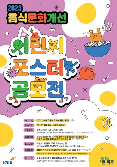 공모 기간은 5월 12일까지이며, 참여 대상은 식습관 형성기인 초등학생으로 파주시 관내 초등학교 재학생이면 참여할 수 있다.