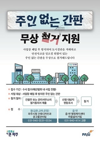 파주시는 관내 전역의 주인없는 간판을 대상으로 ‘주인없는간판 무상철거 지원’사업을 연중 실시한다.