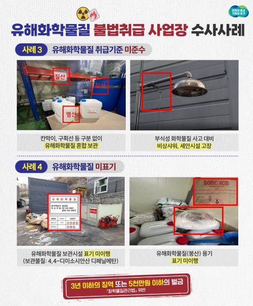 - 무허가 유해화학물질 취급 영업 행위, 시설‧장비 미점검, 취급기준 위반, 보관장소 및 보관 용기 표시사항 미표기 행위 등 중점 단속