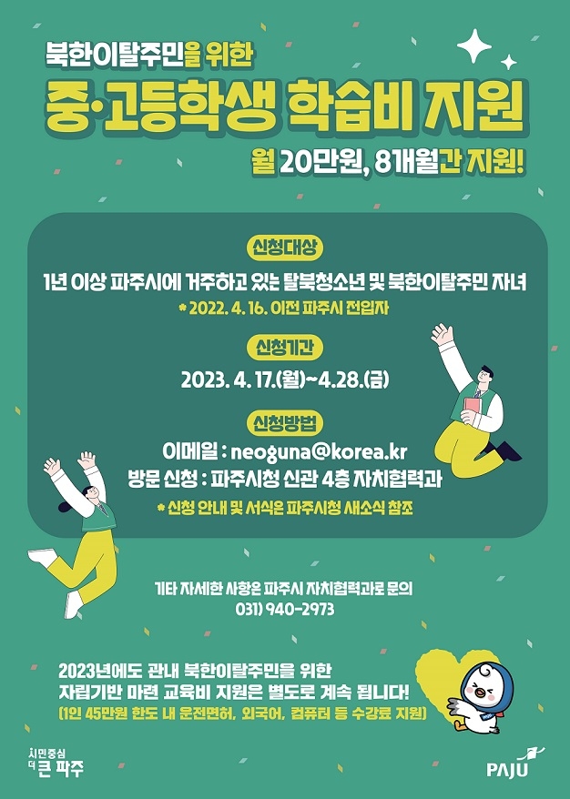 모집 대상은 파주시에 1년 이상 거주한 북한이탈주민 가정의 중·고등학교 재학생이며, 주요 교과목의 온·오프라인 학원 수강료, 참고도서 구입비 등의 학습비를 월 20만 원까지 8개월간 실비 지원한다.