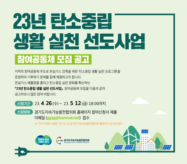 경기도가 탄소중립을 실천하는 공동체에 운영비를 지급하는 ‘2023년도 탄소중립 생활 실천 선도사업’ 참여공동체를 다음 달 12일까지 모집한다.