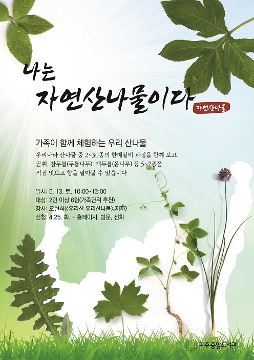 파주중앙도서관은 5월 13일 오전 10시에 가족이 함께 듣는 ‘나는 자연산나물이다’ 강연을 개최한다.