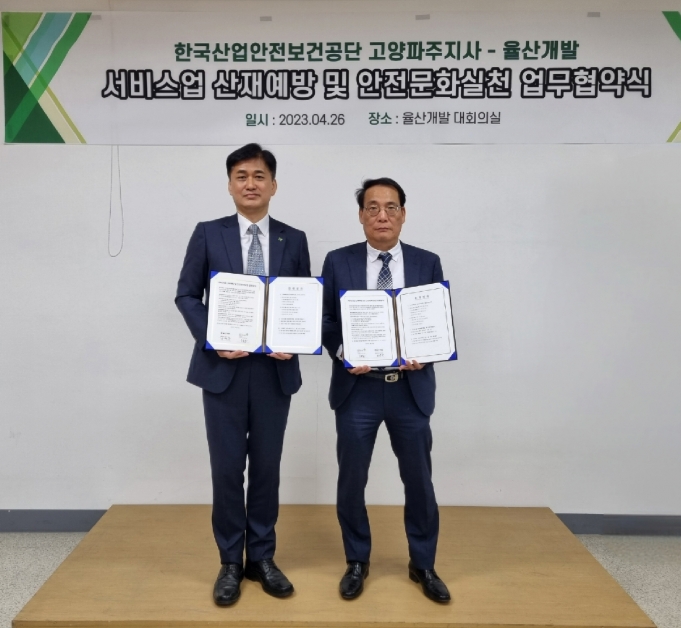 안전보건공단 고양파주지사(지사장 이주갑)와 율산개발(유)*(대표 봉형종)은 4월 26일(수)에 율산개발 본사에서 서비스업 산업재해 예방을 위한 「안전문화실천 업무협약(MOU)」을 체결했다.