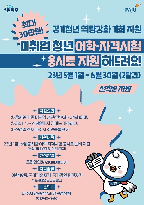 파주시는 경기도와 함께 미취업 청년에게 어학·자격시험 응시료 최대 30만 원을 지원하는 ‘경기청년 역량강화 기회지원’ 사업을 신규 추진한다.