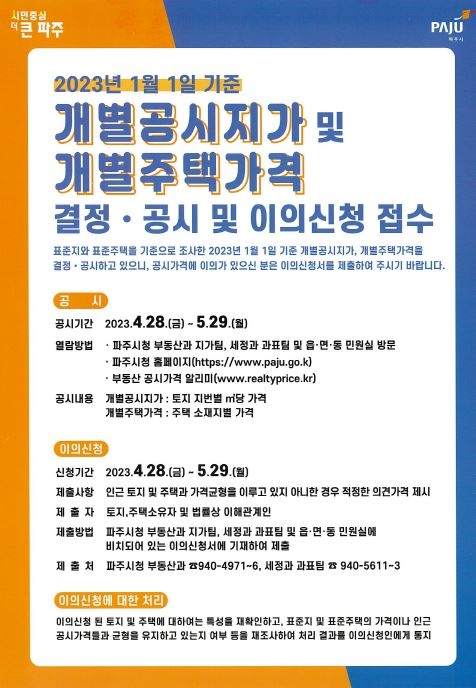 파주시는 2023년 1월 1일 기준 개별공시지가를 4월 28일 결정‧공시하고 5월 30일까지 이의신청을 받는다.