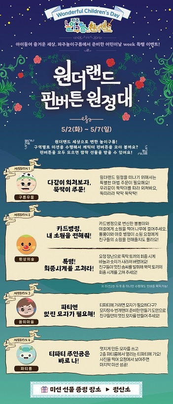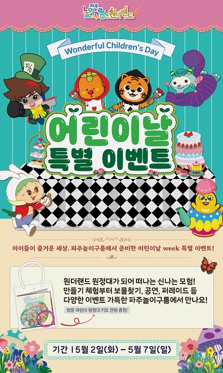 특히, ‘원더랜드 핀버튼 원정대’는 원더랜드 세상으로 변한 파주놀이구름에서 어린이 원정대가 미션을 수행하는 프로그램으로, 소원카드 작성, 회중시계 만들기, 티파티모자 만들기 등 5개의 미션을 수행하면 퇴장 시 깜짝 선물도 받을 수 있다.