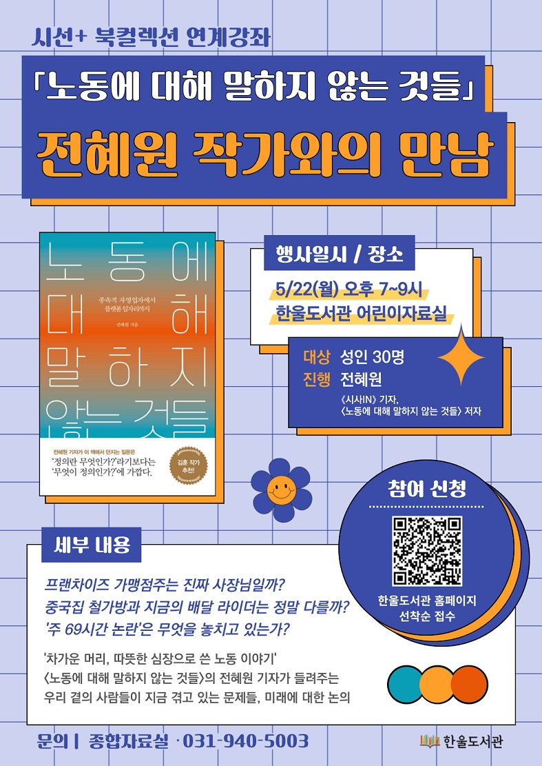 파주시 한울도서관, 전혜원 작가 초청 강연…노동 현장의 문제 진단정치ㆍ행정ㆍ파주시ㆍ파주시의회 | 작성일: 2023-05-03 00:55:47 | 수정일: 2023-05-03 00:56:50 파주시 한울도서관, 전혜원 작가 초청 강연…노동 현장의 문제 진단 - 「노동에 대해 말하지 않는 것들」 저자이자 시사IN 기자 전혜원 작가와의 만남, 선착순 모집 파주시 한울도서관은 오는 22일 어린이자료실에서