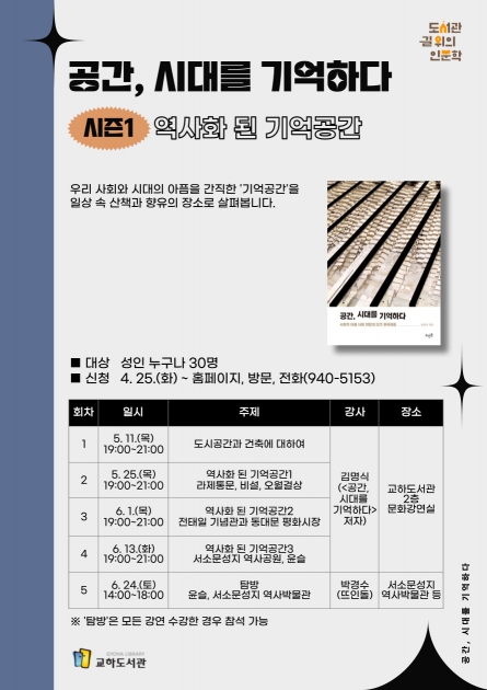파주 교하도서관은 「2023년 도서관 길 위의 인문학 공모사업」에 선정됨에 따라 <공간, 시대를 기억하다>라는 주제로, 5월 11일 첫 강연을 시작한다.