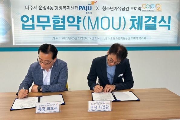 파주시 운정4동은 11일 파주시 청소년재단에서 운영하는 ‘청소년자유공간 모여락’과 업무협약을 체결했다.