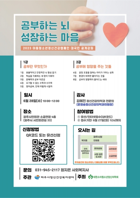 파주시정신건강복지센터(이하 센터)에서는 아동·청소년들의 행복한 삶을 위해 지역주민을 대상으로 6월 28일(수) 시민회관 소공연장에서 정신건강 공개강좌를 개최한다.