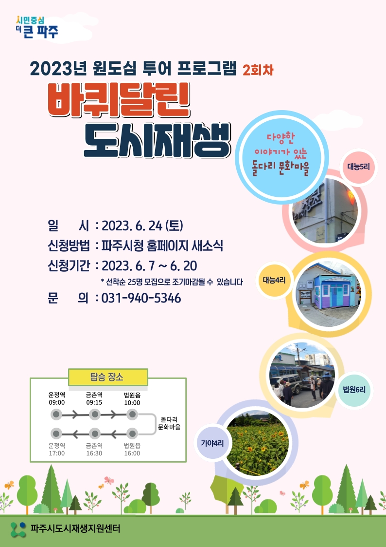 파주시는 오는 20일까지 2023년 원도심 투어프로그램 ‘바퀴 달린 도시재생’ 2회차 참여자 25명을 선착순으로 모집한다.