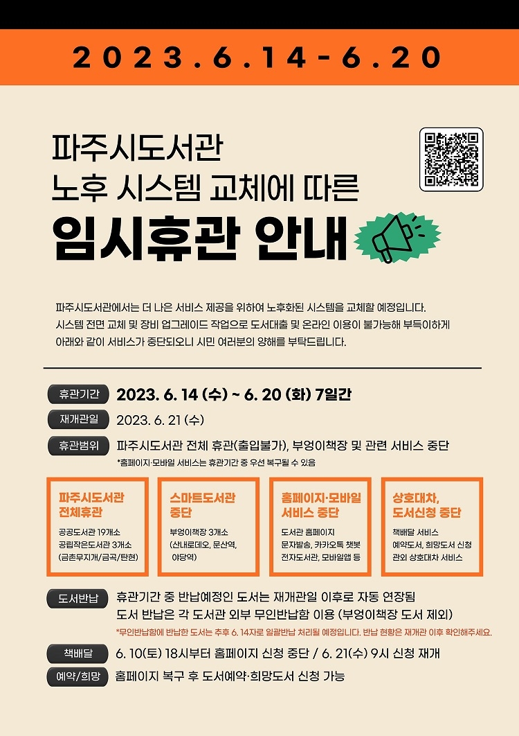 6월 14일부터 20일까지 파주시 도서관 임시휴관…시스템 교체
