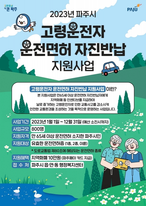 이 사업은 운전면허를 자진반납한 만 65세 이상 고령운전자에게 최초 1회에 한해 인당 10만원의 지역화폐(파주페이)를 지급하는 것으로, 올해는 만 65세 이상 운전자 800명을 대상으로 한다.