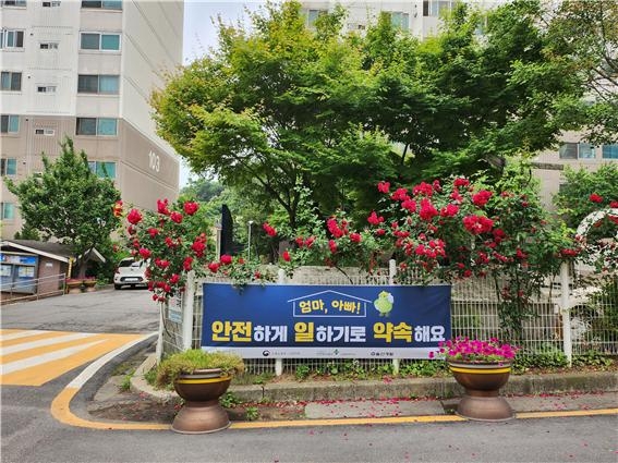 -“엄마, 아빠 안전하게 일하기로 약속해요”라는 안전 메시지는 아파트 출입구, 주차장, 화단 등 눈에 잘 띄는 곳에 게시하였다.