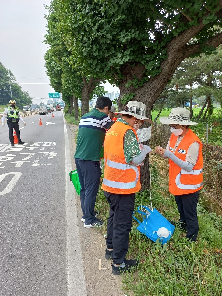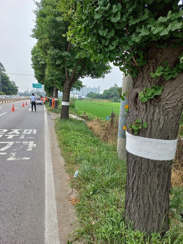 파주시와 파주시자원봉사센터는 통일로변 2곳의 가로수 10그루를 대상으로 ‘가로수 안전띠’를 설치했다.