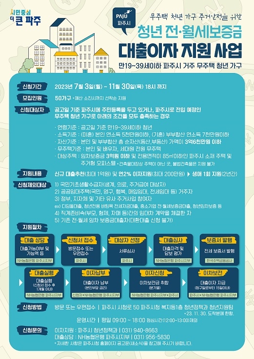 파주시는 7월 3일부터 11월 30일까지 2023년 하반기 청년 전·월세 임차보증금 대출이자 지원사업 신청을 받는다.