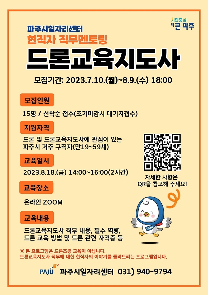 파주시는 7월 10일부터 8월 9일까지 현직 장애인활동지원사와 드론교육지도사가 강의하는 ‘현직자 직무 멘토링(지도)‘ 온라인 과정의 참여자를 모집한다.