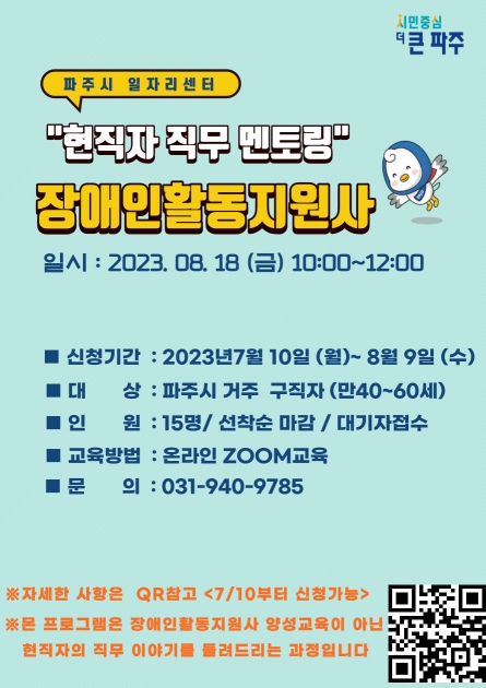 파주시, 현직자 직무 멘토링 온라인 교육 개설 - 장애인활동지원사 및 드론교육지도사의 비법 전수