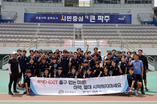 파주경찰서(서장 이재성)는 지난 7월 5일(수) 금촌에 위치한 파주스타디움에서 파주시민축구단과 함께 마약 범죄 예방을 위한 #NO EXIT 챌린지 협업 활동을 진행하였다.