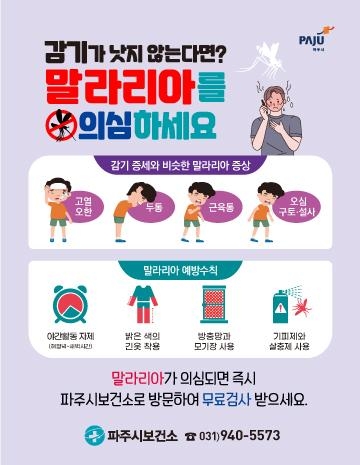 임미숙 파주보건소장은 “매년 방역 활동에 솔선수범하는 파주시 새마을회의 노고에 깊은 감사를 드리며, 파주시에서도 월 2회 민관군 합동방역을 실시해 말라리아 퇴치를 위해 적극 노력하겠다”라며, “시민분들 또한 모기에 물리지 않도록 각별히 주의하고 예방 수칙을 준수해 주시기를 당부드린다”라고 말했다.