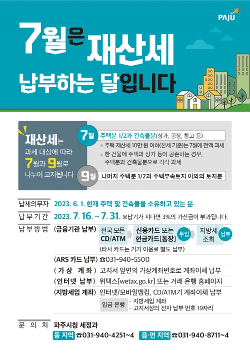 파주시는 2023년 7월 정기분 재산세(주택·건축물) 404억 원을 부과했다.