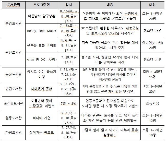 중앙도서관 청소년 캠프는 7월 15일에 시작하며, 각 도서관에서는 초등, 청소년을 대상으로 사서와 함께하는 다양한 주제의 프로그램 9개가 진행된다.